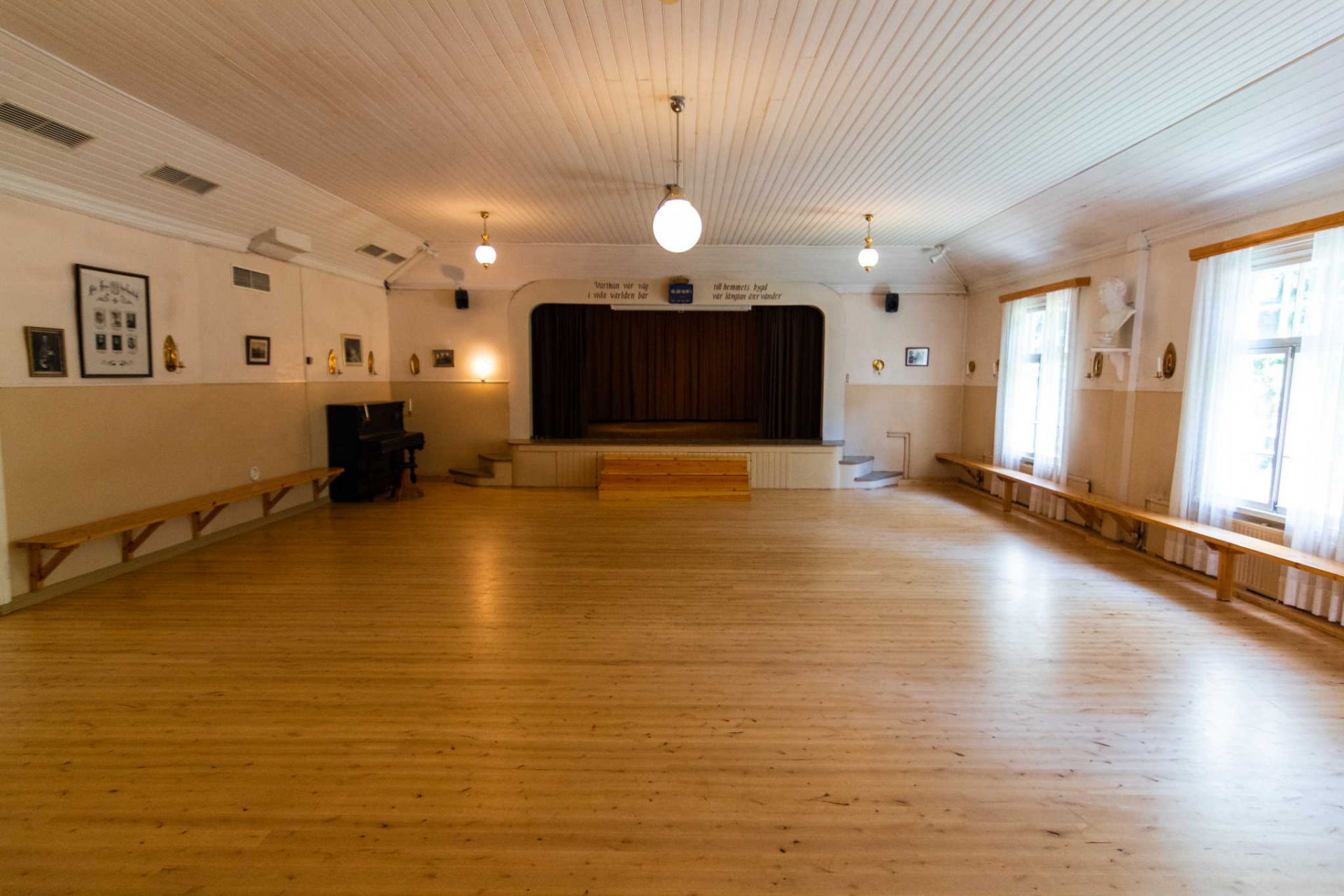 Längs med festsalens väggar löper väggfasta bänkar. Detta är bra att ta i beaktande då bordsplaceringen för festen planeras. Salen rymmer bra drygt 100 personer vid sittande bord. På den ena kortsidan av salen finns en scen.Tamburen skymtar bak i salen.